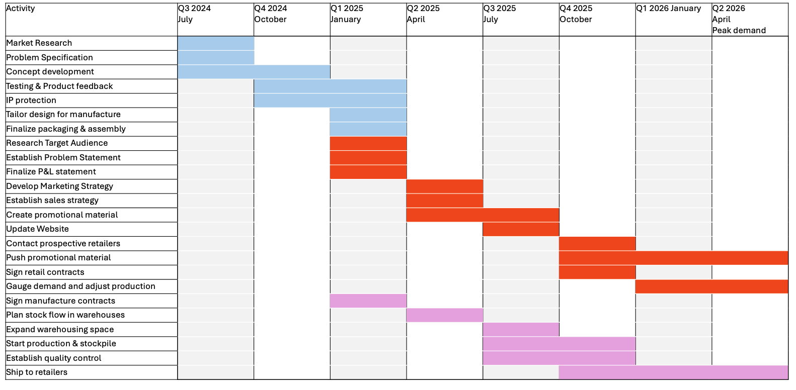 A product launch plan was created to ensure sufficient time for R&D and to establish transportation logistics, production capabilities and a strong marketing strategy to optimise consumer exposure.